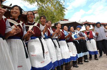 写真(右):麗江の古い街・四方街で民族舞踊を披露するナシ族の女性