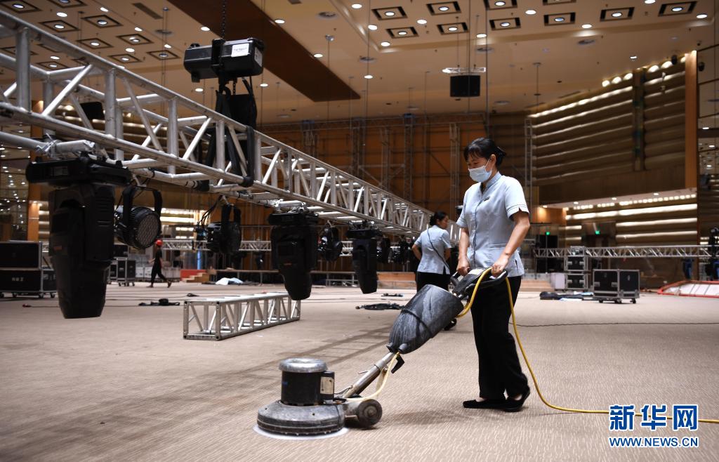 4月10日、メイン会場の清掃作業を行うスタッフ。