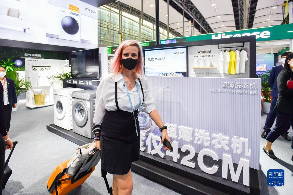 労敏妮さんが広交会展示館で、中国企業の家電デザインの流行をチェックした。