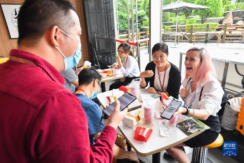 広交会のフードコートで昼、ある出展者が労敏妮さん(右)に製品をセールスした。労敏妮さんが工業デザイナーであることを知ると、出展者は今後の協力を期し自ら微信に登録した。