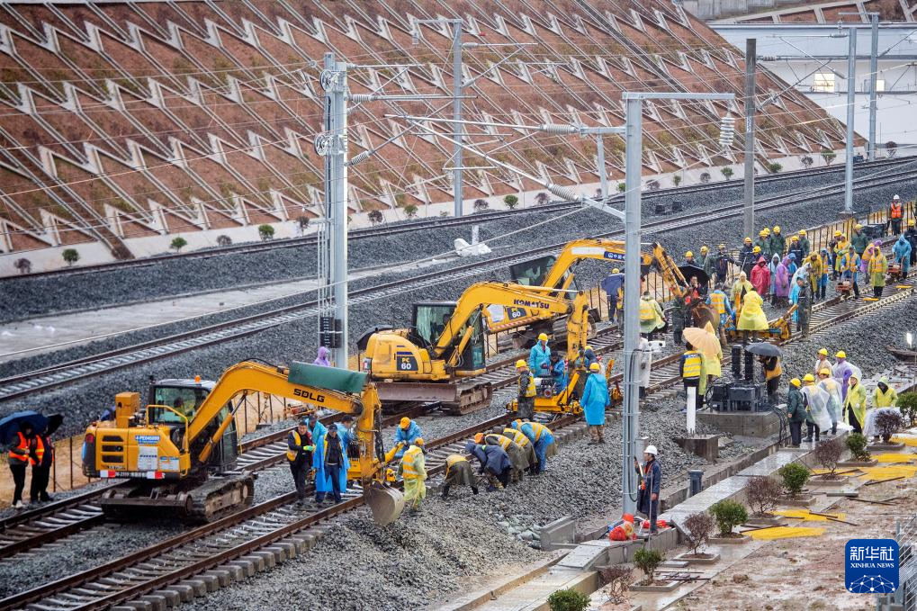 5日、渝廈高速鉄道の重慶区間で、重機を用いて線路の切り替えにあたる作業員。(重慶=新華社記者/唐奕)