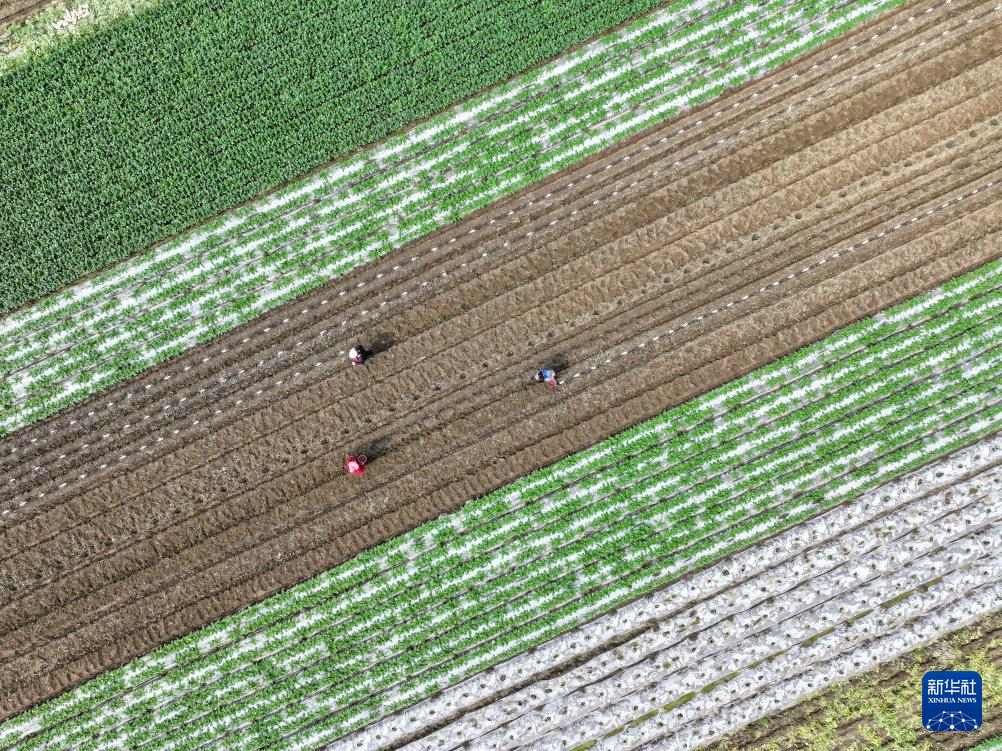 12日、重慶市潼南区桂林街道の双壩野菜栽培基地で農作業に励む農家の人々。(ドローンから、重慶=新華社記者/王全超)