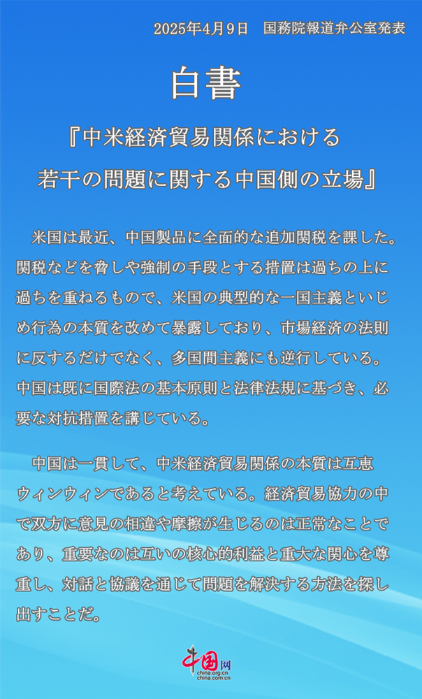 国務院報道弁公室は9日、「中米経済貿易関係における若干の問題に関する中国側の立場」と題する白書を発表した。白書では、中米経済貿易関係の実態と、それに関する問題についての中国の政策的立場を明らかにしている。