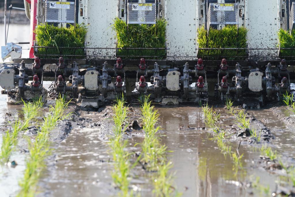 8日、黒竜江北大荒農業友誼分公司の水田で作業する田植え機。(双鴨山=新華社記者/王松)