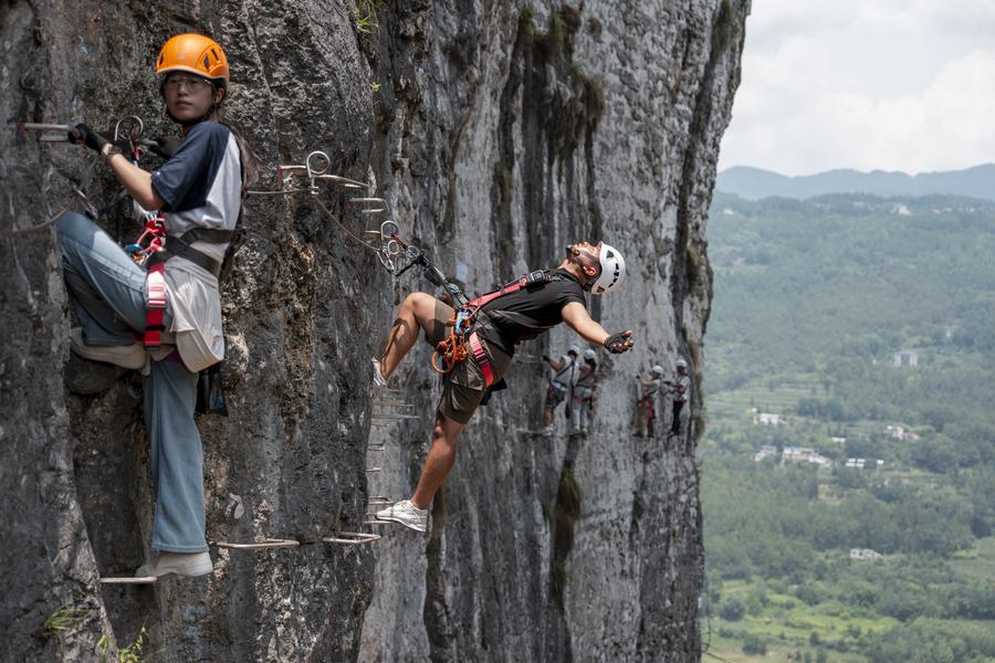 8日、湖北省恩施トゥチャ族ミャオ族自治州恩施市新塘郷紅花峰林風景区で、ワイヤーや鉄の杭などの固定設備を使って崖を登る「ビア・フェラータ」を体験する観光客。(恩施=新華社記者/伍志尊)