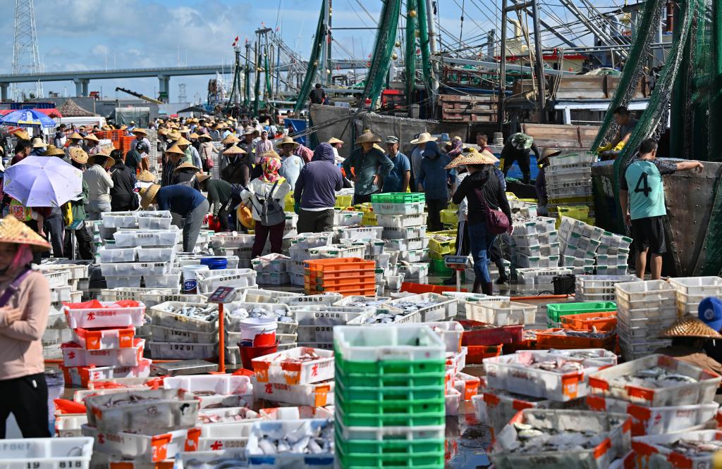 21日、海南省文昌市の清瀾漁港埠頭(ふとう)で、水揚げや取り引きをする漁師や業者。(文昌=新華社記者/郭程)