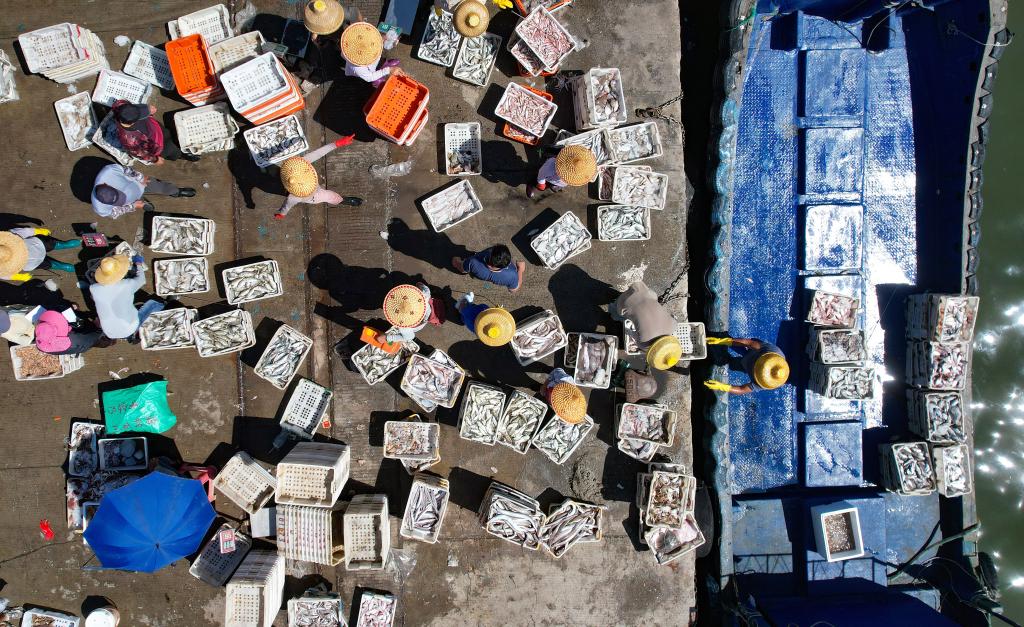 21日、海南省文昌市の清瀾漁港埠頭(ふとう)で、水揚げや取り引きをする漁師や業者。(ドローンから、文昌=新華社記者/郭程)