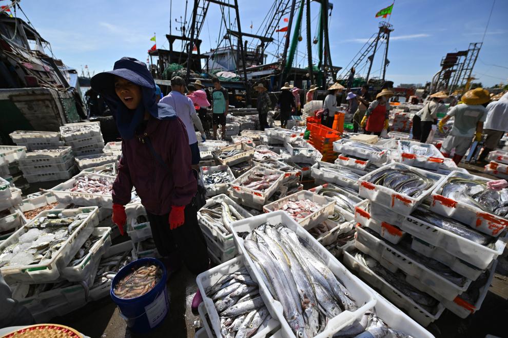 21日、海南省文昌市の清瀾漁港埠頭(ふとう)で、水揚げや取り引きをする漁師や業者。(文昌=新華社記者/郭程)