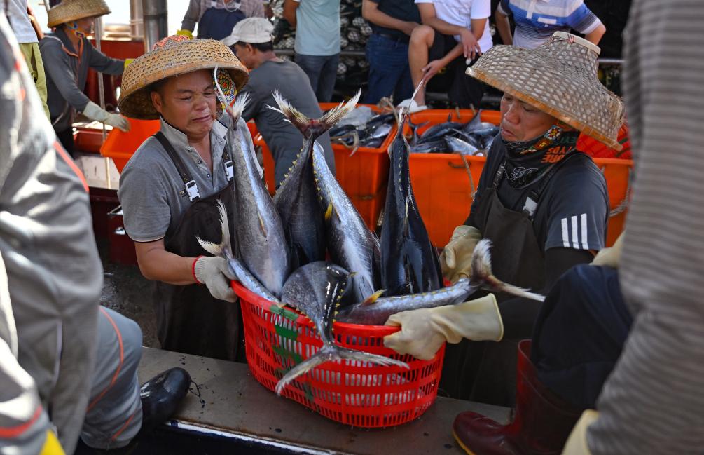 21日、海南省文昌市の清瀾漁港埠頭(ふとう)で水揚げされた魚を運ぶ業者。(文昌=新華社記者/郭程)