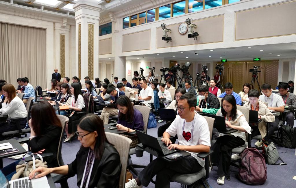 19日、記者会見に出席する報道関係者。(北京=新華社記者/才揚)