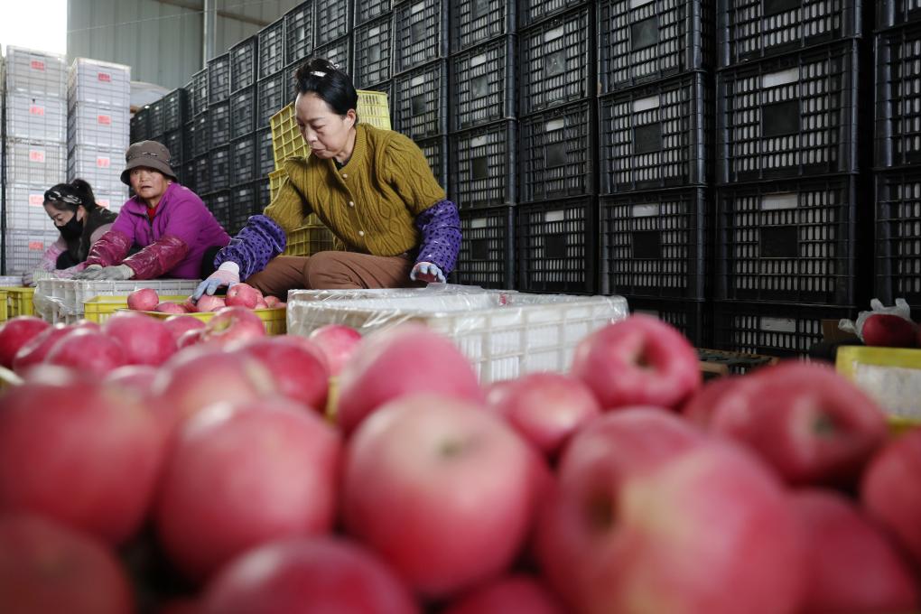 14日、甘粛省隴南市礼県永興鎮のリンゴ倉庫で、リンゴを分別する作業員。(隴南=新華社記者/陳斌)