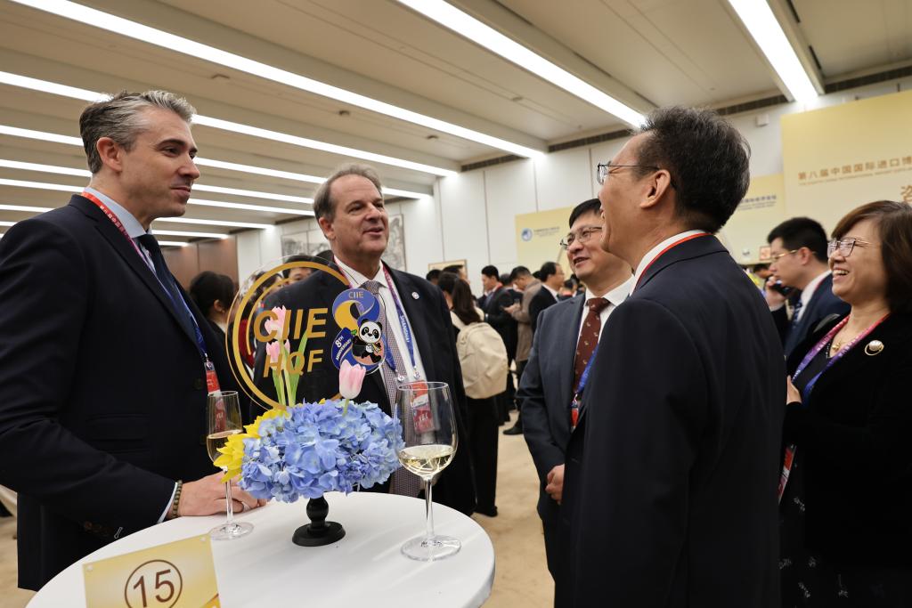 5日、開幕式の待機スペースで交流する来賓ら。(上海=新華社記者/方喆)