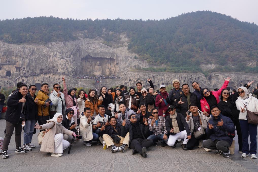 4日、河南省洛陽市の竜門石窟風景区で集合写真を撮るインドネシアの観光客。(洛陽=新華社記者/戴明軒)