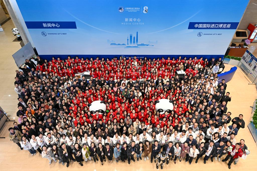 10日、第8回輸入博のプレスセンターで、集合写真を撮るボランティアとスタッフ。(上海=新華社記者/陳浩明)