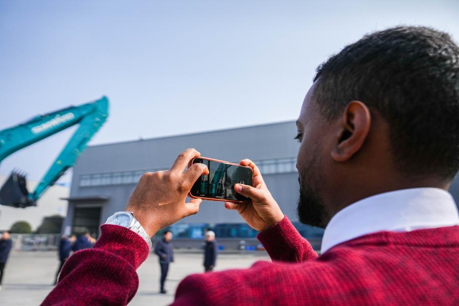 6日、長沙市の山河工業城でロングリーチ油圧ショベルSWE1650FLRを撮影する取引先代表。(長沙=新華社記者/陳思汗)