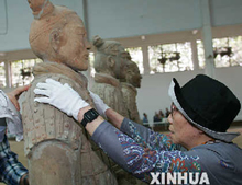 陝西省の兵馬俑博物館では22日、目の不自由な日本人観光客7人が訪れ、世界8大奇跡の1つとされる兵馬俑に触れた。写真は兵馬俑博物館1号坑修復区で兵馬俑に触れる目の不自由な観光客。