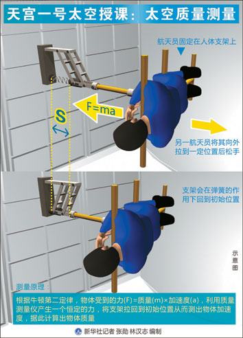 王氏は、天宮内の質量測定装置は、ニュートン力学の運動の第2法則(物体の受ける力=質量×加速度)を応用していると説明した。実験に使用されたバネは永久に不変の力を生むことができ、加速度を測定できるシステムも採用された。これにより、運動の第2法則を使うことで、身体の質量を計算できるようになった。