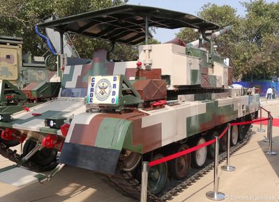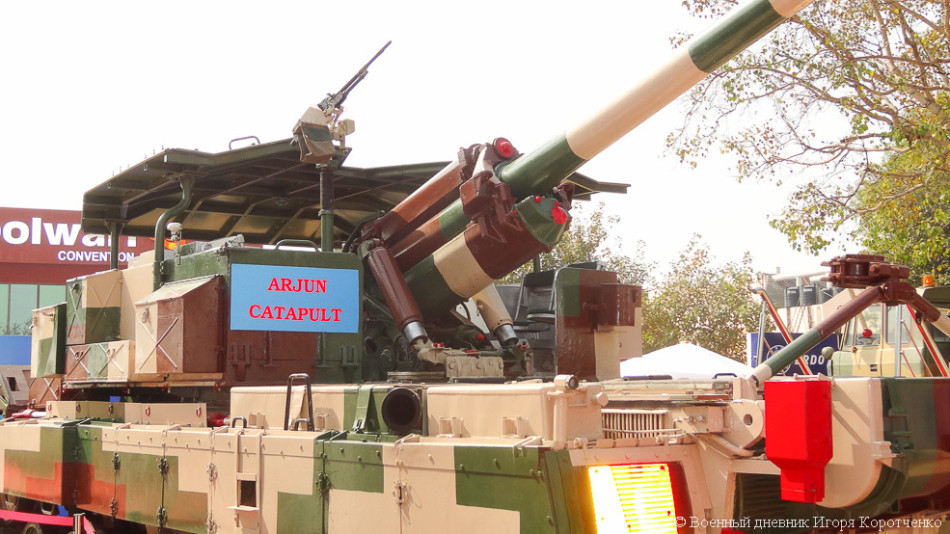 国際武器展示会の場を借り、インド軍需産業は国産の最新の130mm自走砲「カタパルトMK-2」を大々的に展示した。同自走砲は、旧ソ連の130mm砲「M-46」と、戦車「アージュンMK-2」のシャーシを結びつけた製品だ。この設計プランは防御力が極端に低いという欠点があるが、既存の武器を使うため迅速な生産・配備が実現できる。