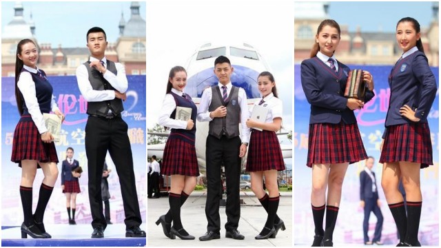 成都航空旅行職業学校は6月24日、淑女シリーズと紳士シリーズの学生服を発表した。ワイシャツ、ニットベスト、チェック柄のスカート、ネクタイ、ブレザー、ベストというスタイルはイングランド風、国際的であり、現代的な紳士・淑女らしく、同校の学生も気に入っている。この学生服が発表されると、ネットユーザーからは「また人の学校の制服か」、「この学生服を着れば美レベルが一気に上がる」、「中国の学生服の逆襲だ」などの羨む声が上がった。写真は、国際的な学生服を紹介する学生。