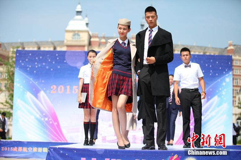 成都航空旅行職業学校は6月24日、淑女シリーズと紳士シリーズの学生服を発表した。ワイシャツ、ニットベスト、チェック柄のスカート、ネクタイ、ブレザー、ベストというスタイルはイングランド風、国際的であり、現代的な紳士・淑女らしく、同校の学生も気に入っている。この学生服が発表されると、ネットユーザーからは「また人の学校の制服か」、「この学生服を着れば美レベルが一気に上がる」、「中国の学生服の逆襲だ」などの羨む声が上がった。写真は、国際的な学生服を紹介する学生。