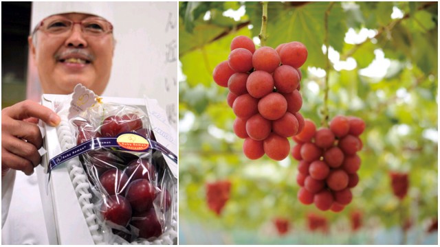 「ルビーロマン」は鮮やかな赤色で糖度が高く、直径は巨峰の2倍の3センチに達する。ホテル日航金沢が競り落としたこのブドウには26粒ついており、1粒当たりの価格は3万8500円になる。