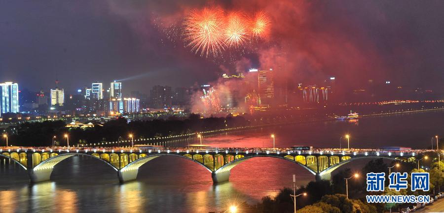7月25日、長沙市の橘子洲大橋の上空に打ち上げられた鮮やかな花火。7月25日夜、長沙市の湘江橘子洲は週末の音楽花火大会を行なった。この花火大会のテーマは「花火姑娘」で、20分間にわたり打ち上げられた。