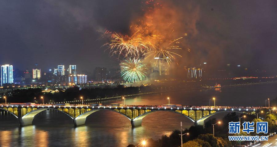 7月25日、長沙市の橘子洲大橋の上空に打ち上げられた鮮やかな花火。7月25日夜、長沙市の湘江橘子洲は週末の音楽花火大会を行なった。この花火大会のテーマは「花火姑娘」で、20分間にわたり打ち上げられた。
