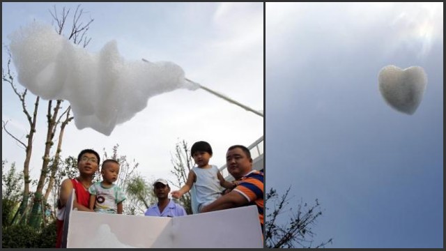 8月16日、河南省鄭州市沙口山の通りで、人工の「白い雲」が市民の注目を集めた。星、ハート、綿あめなどの形をした「雲」は子供たちを引きつけた。これらの箱を管理する男性によると、箱は「雲製造機」で、空気より軽い圧縮ガスと箱の中の発泡液が混ざり空中に浮き、数百メートルの高さまで浮くことができる。この「雲製造機」が作る「雲」は1日に1万元以上の利益をもたらすという。