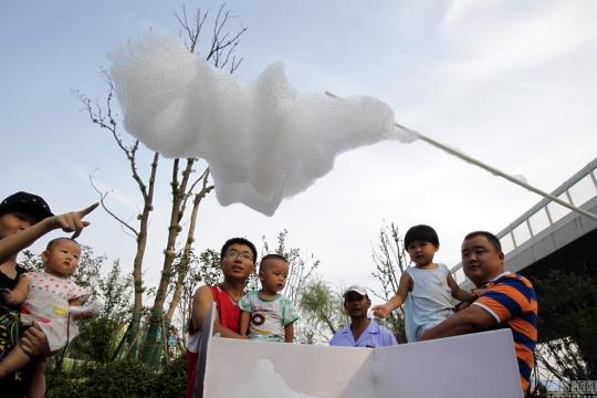 8月16日、河南省鄭州市沙口山の通りで、人工の「白い雲」が市民の注目を集めた。星、ハート、綿あめなどの形をした「雲」は子供たちを引きつけた。これらの箱を管理する男性によると、箱は「雲製造機」で、空気より軽い圧縮ガスと箱の中の発泡液が混ざり空中に浮き、数百メートルの高さまで浮くことができる。この「雲製造機」が作る「雲」は1日に1万元以上の利益をもたらすという。