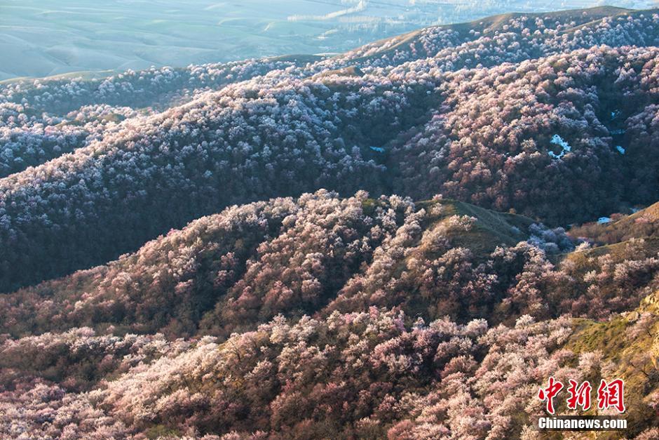 新疆ウイグル自治区イリ・カザフ自治州霍城県の福寿山にある1万ムーにわたるあんずの花が見頃を迎えた。遠くに見える雪山、ピンク色のあんずの花、近くの牛と羊が合わさり春のロマンチックな風景になっている。