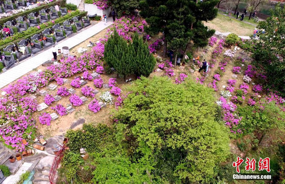 4月2日、福州市の各墓地は墓参り客のピークを迎えた。福州市のある墓地は、上空から見ると花畑のようにきれいで整っている。