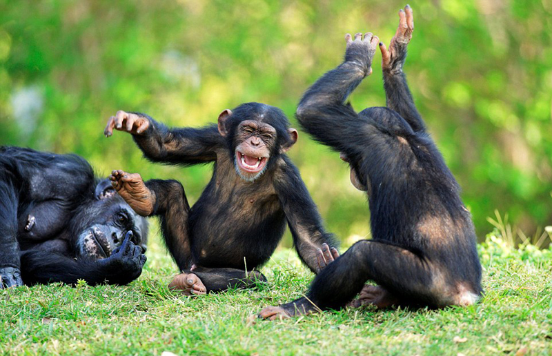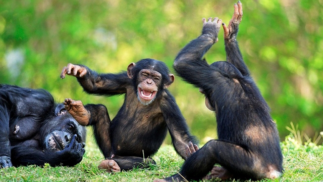 イギリスの『デイリー・メール』の6月5日の報道によると、写真家がこのほど、アフリカ中部のコンゴの林で、2匹のチンパンジーが楽しそうに何かを話して大笑いする面白い様子を撮影した。