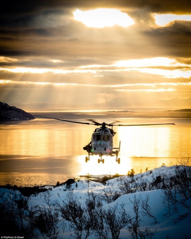 海軍ヘリが夕日の下、巡航任務を遂行