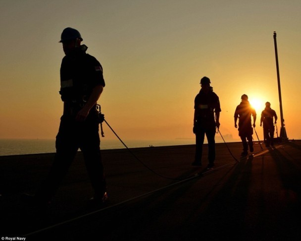海軍兵士数人が、夕日をバックに甲板を歩く