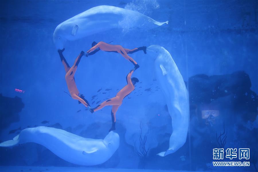 6月6日、天津海昌極地海洋世界で、「風車」の形を作るトレーナーとシロイルカ。
