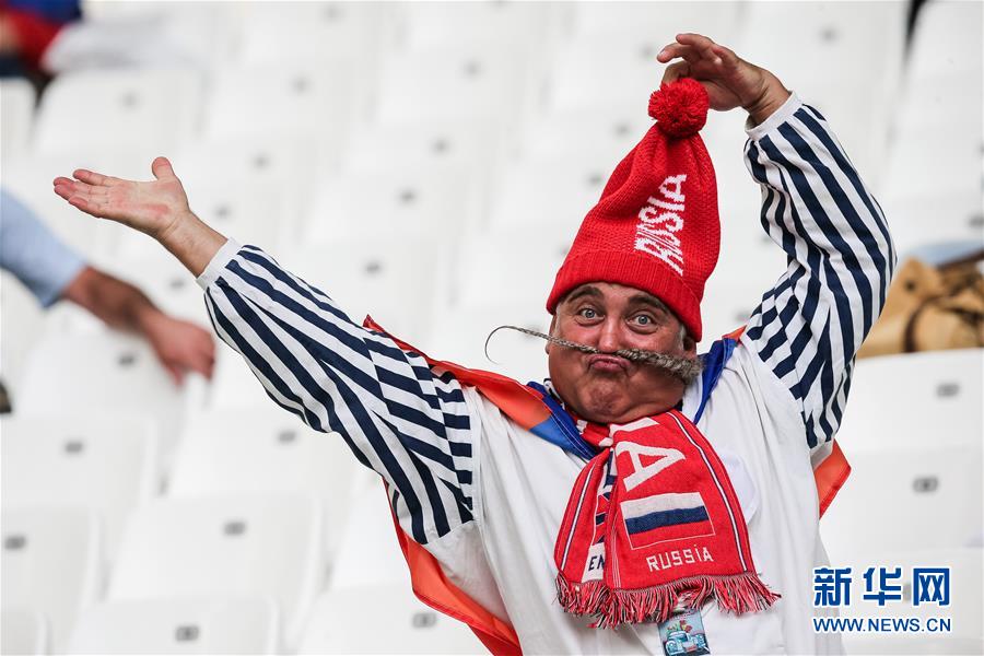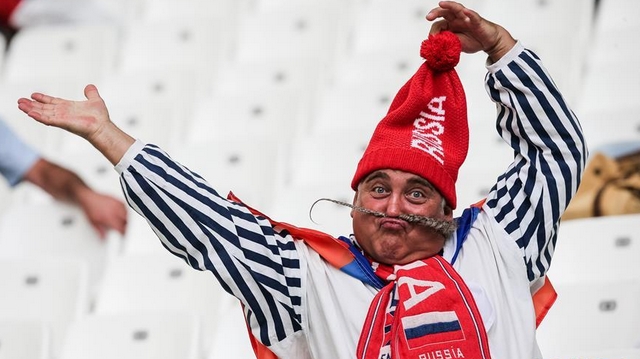 6月11日、試合開始前に記念写真を撮るロシアチームのサポーター