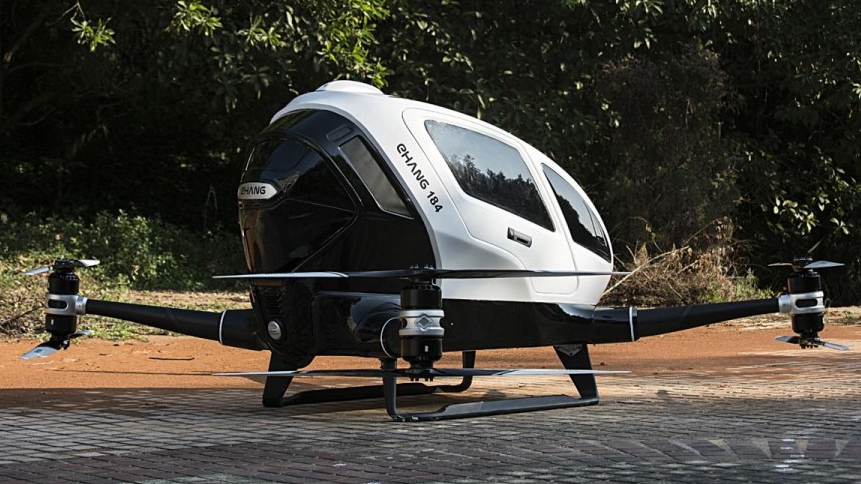 「EHang 184」は、「1人乗り、8つのプロペラ、4つのアーム」という意味。外観はヘリコプターに似ており、全自動飛行を実現する。