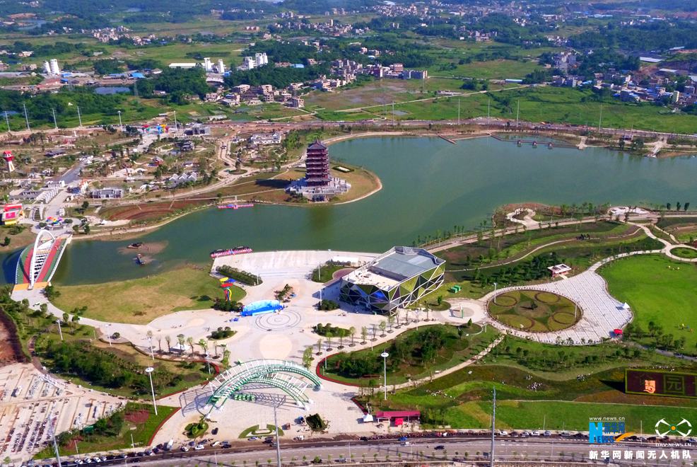 広西園林園芸博覧会を空撮 色とりどりの玉林市