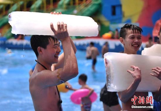 6月23日、重慶市で最高気温が40度近くになった。洋人街の水上楽園でアイスチャレンジが行われ、多くの観光客が氷の塊を抱えて厚さを凌いだ。