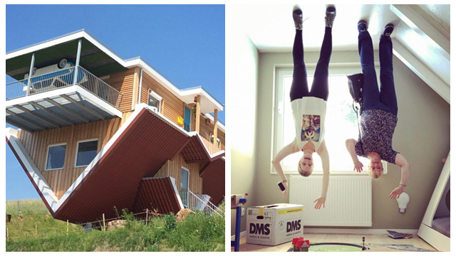 このカフェに入ると頭がくらくらする感覚に陥るかも知れない。外から見ると建物が上下逆さになっており、自動車が逆さに停まっている。店内に入るとバスルーム、水槽、便器、浴槽など何もかもが逆さで、キッチンにはテーブルが上についており、子供部屋にはおもちゃの車が逆さにぶら下がっている。