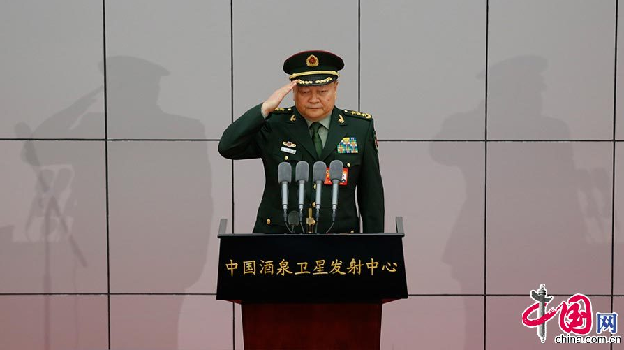 有人宇宙船「神舟11号」の打ち上げ成功を発表する中国有人航天工程の総指揮者で今回の有人宇宙船飛行任務の総指揮者の張又侠氏