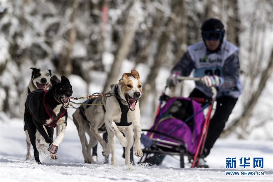 2月18日、スイス・ヴァリス地方のオーバーワルドで、犬ぞりに乗るフランス人選手のアンドリュー・マイズさん。同日、スイス・ヴァリス地方のオーバーワルドで国際犬ぞりレースが開催された。