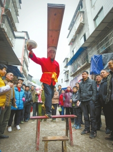 盆が陳長発さんの頭にくっついているようである。彼は1滴の汁もこぼすことなく、人混みの中をうまくすり抜ける。