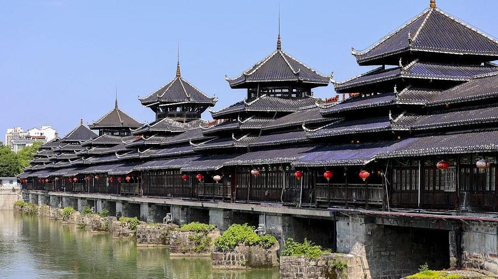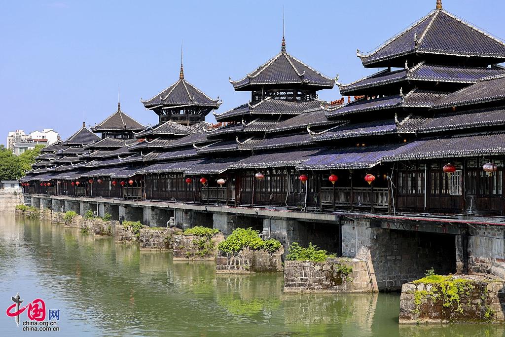 龍津風雨橋は全長246.7メートル、幅12.2メートルで、中空式木造屋根付き橋。16個の橋台は船の形をしており、すべて巨大な四角い石灰岩を削って作られた。その上には建物があり、中央は道路、両側に店が並んでいる。この橋は2000年に世界最長の風雨橋としてギネス記録に認定された。