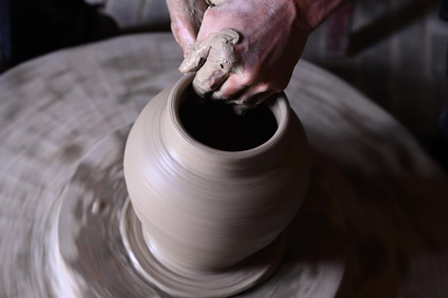 18日、周寧県浦源鎮萌源村の月山古竜窯の工房で、硋器を成形する肖家漲さん。(寧徳=新華社記者/姜克紅)