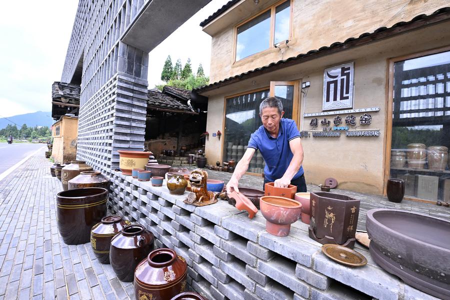 18日、周寧県浦源鎮萌源村の月山古竜窯で、展示用の伝統的硋器を並べる肖家漲さん。(寧徳=新華社記者/姜克紅)