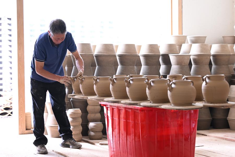 18日、周寧県浦源鎮萌源村の月山古竜窯の工房で、伝統的硋器の素地を整える肖家漲さん。(寧徳=新華社記者/姜克紅)