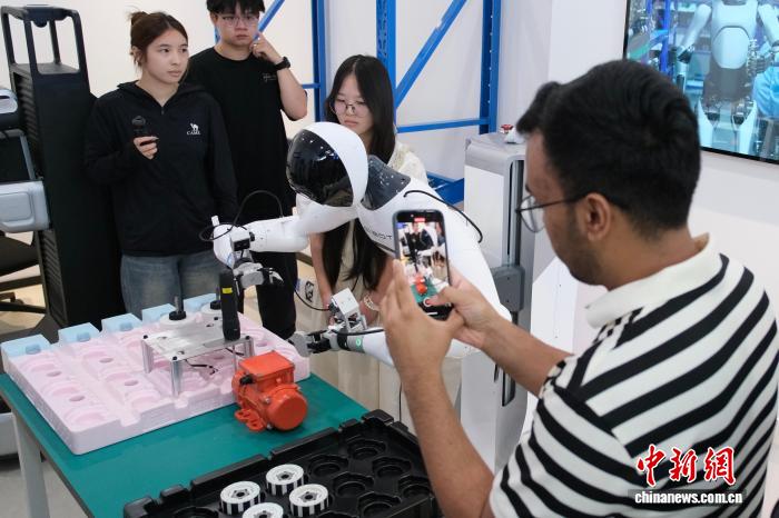 データ収集中のロボットの前で写真を撮影する見学者(7月31日撮影・曹丹)