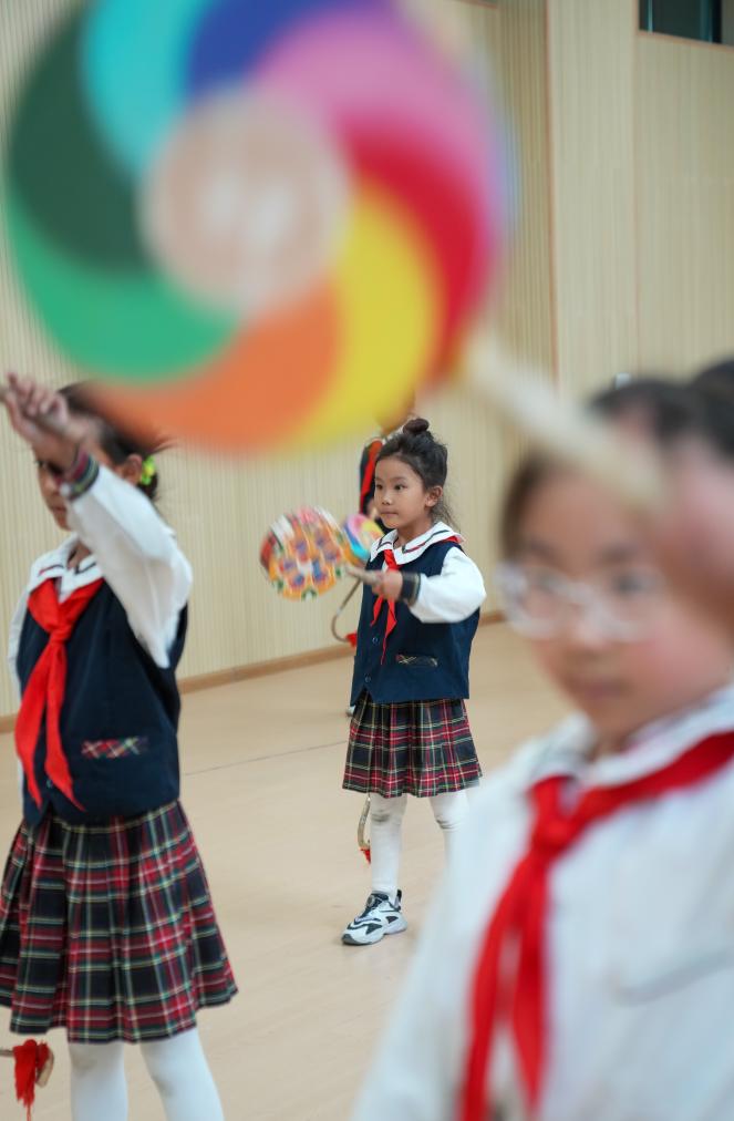 11日、ラサ市実験小学校で、レバ踊りを練習する児童ら。(ラサ=新華社記者/晋美多吉)