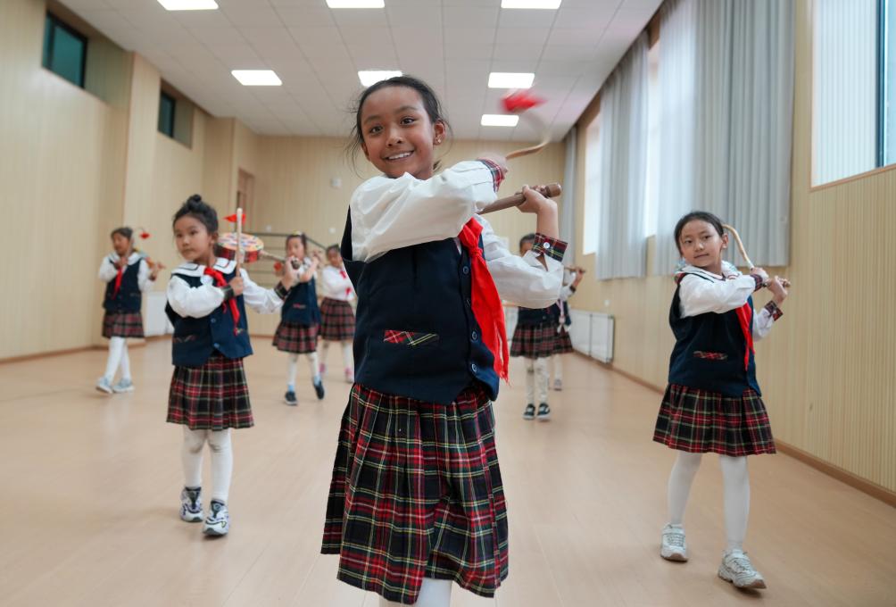 11日、ラサ市実験小学校で、レバ踊りを練習する児童ら。(ラサ=新華社記者/晋美多吉)